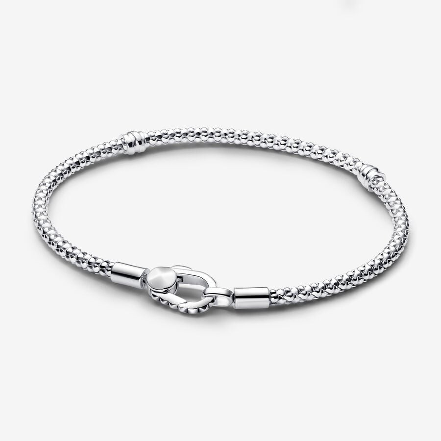 Oto jeszcze więcej sposobów noszenia ulubionych charmsów. Nasza bransoletka o splocie ćwiekowym ma unikalną teksturę, która doda głębi i wymiaru Twojej stylizacji. Zamknięcie na karabińczyk zapewnia bezpieczne noszenie. Noś ją bez dodatków jako subtelną ozdobę lub spersonalizuj ulubionymi charmsami.