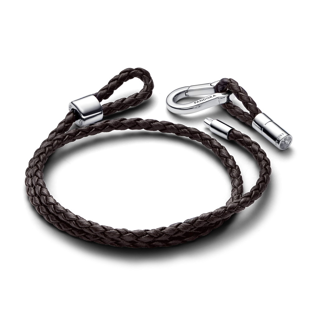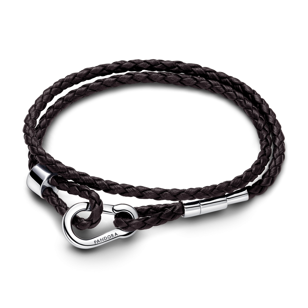 Podwójna pleciona bransoletka Pandora Moments z brązowej skóry jest skromna i jednocześnie ekstrawagancka. Skórzana bransoletka owija dwukrotnie nadgarstek i ma srebrne zapięcie karabińczykowe z wygrawerowanym po obu stronach logo Pandora. Przesuń metalowy suwak znajdujący się na jednym końcu bransoletki, aby wyregulować jej długość, a następnie dodaj i zabezpiecz charmsy metalowym suwakiem znajdującym się na drugim końcu. Tę nowoczesną bransoletkę możesz ozdobić maksymalnie 16-18 charmsami lub charmsami-zawieszkami.