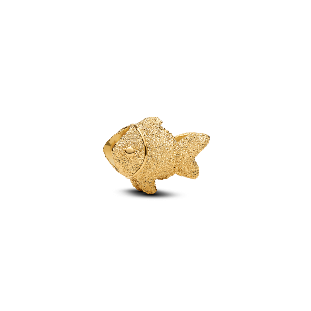 Płyń z nurtem. Ten platerowany 14-karatowym złotem miniaturowy charms w kształcie rybki, zdobiony diamentową mozaiką, która nadaje mu lśniącą teksturę, symbolizuje wolność i łagodność.