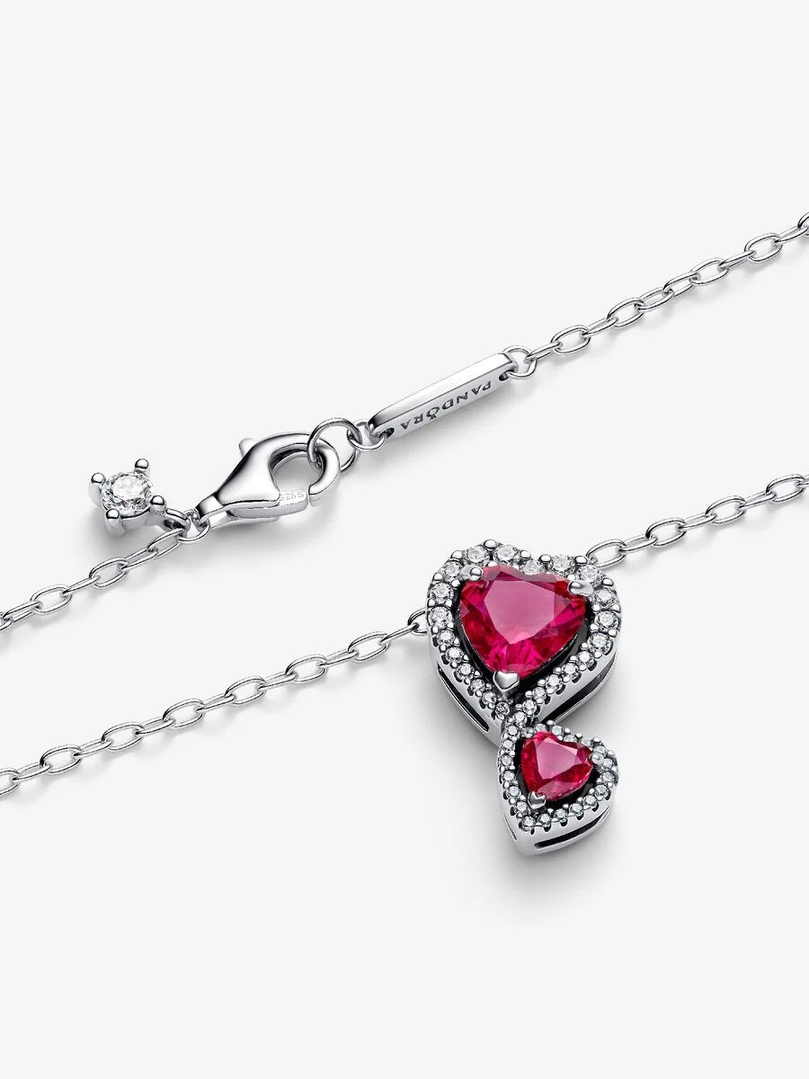 Ten lśniący naszyjnik został ozdobiony dwoma soczyście czerwonymi kryształami syntetycznymi o szlifie serce, obramowanymi obwódką z przezroczystych cyrkonii sześciennych. Regulowany w trzech długościach naszyjnik jest idealny do noszenia solo lub w kaskadowych stylizacjach.