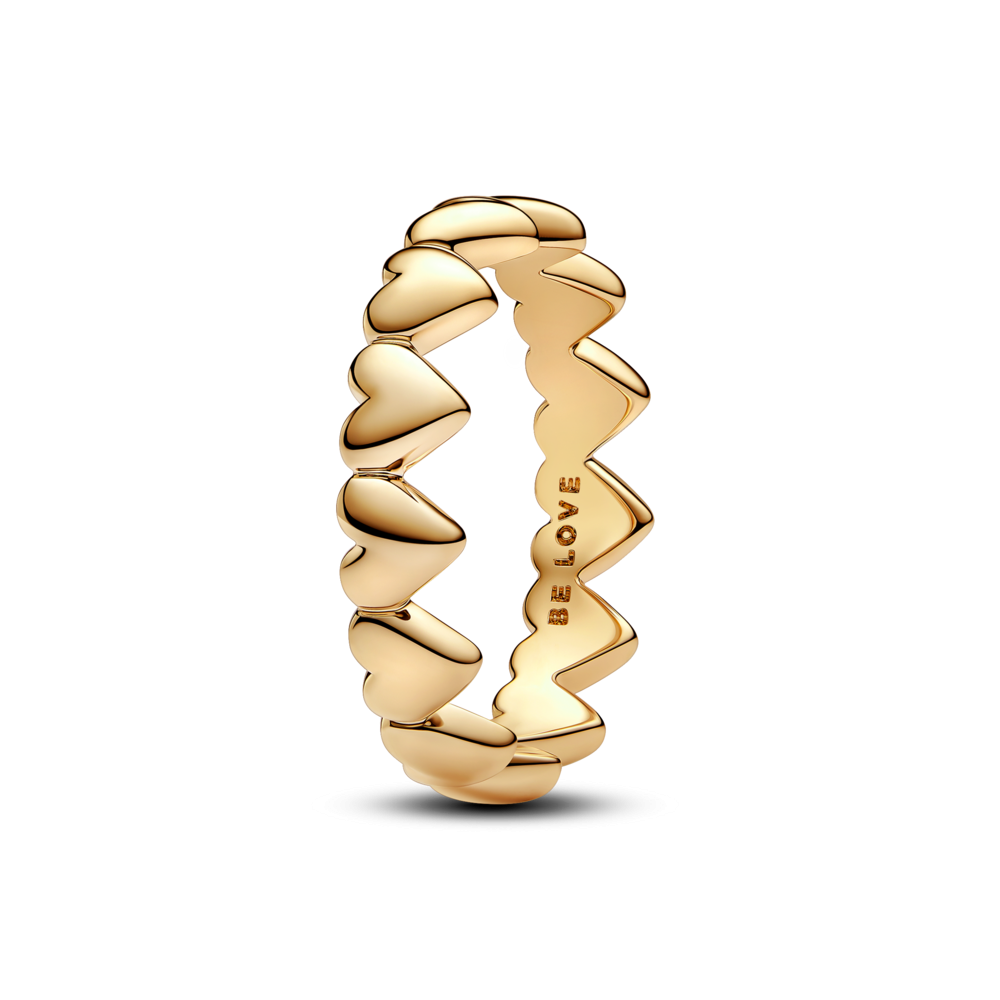 Podaruj prezent od serca w postaci platerowanego 14-karatowym złotem pierścionka złożonego z pasma serc. Ten romantyczny pierścionek składa się z pasma misternych serduszek połączonych w obrączkę i będzie wyglądał równie pięknie solo, jak i w połączeniu z innymi pierścionkami Pandora w kontrastujących odcieniach. Podaruj go jako symboliczny wyraz miłości lub sprezentuj sobie jako ozdobę, po którą chętnie będziesz sięgać na wiele różnych okazji.