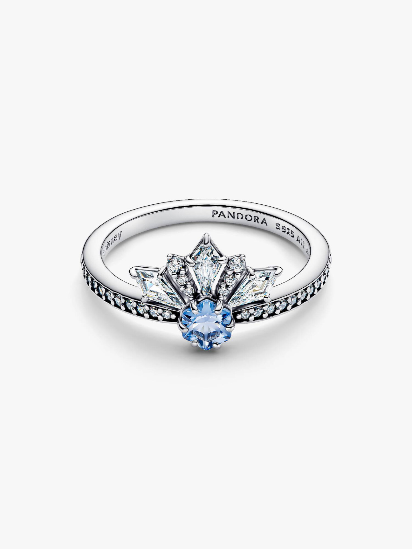 Lśnij jak Królowa Śniegu. Pokaż, jak bliska jest Ci Kraina Lodu, nosząc ten zachwycający srebrny pierścionek zwieńczony tiarą błękitnych i bezbarwnych kamieni.