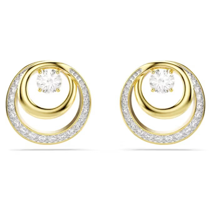 Odkryj okrągły styl tych kolczyków Hyperbola z powłoką w kolorze złota. Każda hipnotyzująca ozdoba składa się z centralnie umieszczonej cyrkonii Swarovskiego otoczonej metalicznymi spiralami i błyszczącą oprawą brukową. Noś je z pasującym naszyjnikiem lub pierścionkiem, aby podkreślić nowoczesną elegancję.